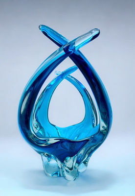 This vintage art glass piece, known as a “cross arm” or “pincher,” features an uncommon teal blue color. It is distinguished by its unique structure, with two elongated arms that cross at either end, creating a dynamic and visually striking form.