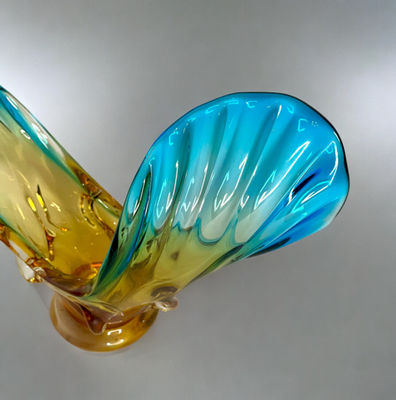 Explore this unique stretch by EDAG Crystal which resembles two clam shells at its ends, showcasing the brand's iconic blue-over-amber color palette. An excellent addition to any collection, it pairs beautifully with various colorways, highlighting the elegance of Canadian vintage art glass.