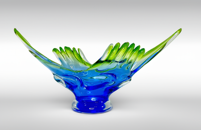 This captivating EDAG Crystal stretch features a vivid lime green rim transitioning into a deep, vibrant blue. The piece’s striking form, reminiscent of elegant wings or fingers, creates a mesmerizing visual flow. Rare in both form and colourway, it stands as a bold EDAG piece.